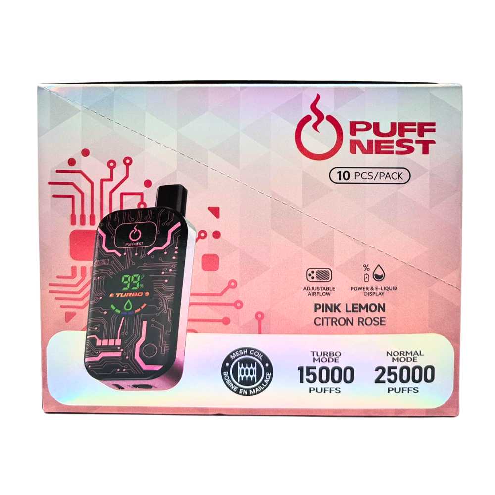 Enjoy the PUFF NEST 25000 PUFFS Pink Lemon flavor, featuring 18 mL e-liquid, 650 mAh rechargeable battery, and 2% nicotine. Experience up to 25,000 puffs with a sleek design and digital display. Available online at Canada’s best price.
